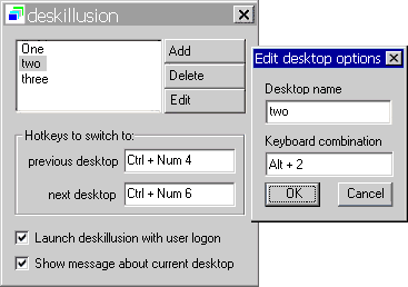 Version: 1.1Release date: 09/16/2005 Author: LynX Home Page: ? License: Freeware OS: Windows 98/2k/2k3/XP Download size: 83 kB Description: When you launch a lot of applications, you get many windows on screen (desktop), and switching between them became very difficult. Deskillusion allows avoiding such trouble, by increasing the number of available to you desktops, and giving you possibility to switch between them. This allows to you freely, and easy, group launching programs, by any criterions. There is an illusion, like you working on multiscreen system, where on every screen you are launching different applications. Deskillusion are fast/functional/small virtual desktop manager. This program has simple interface, and give you possibility to create and use 100 desktops, between which you can switch by hotkey combination (you can specify this combination manually), and this is not all features! Download deskillusion |
