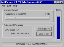 Version: 1.3.0Release date: 09/24/2002 Author: Kalle Immonen Home Page: http://reaper.letku.net/ramboss/ License: Freeware OS: Windows 95/98/NT/ME/2K/XP Install support: No Download size: 58 kB Description: RAMBoss is a small, yet effective utility for freeing up system RAM on Windows 95/98 systems. Also should work on other systems such as Win 2000 or XP, but you'll get most out of it on 95/98. Why use RAMBoss? The way that Windows treats memory (at least in 95/98 systems) is not very good, and sooner or later the system will most probably crash. You can use RAMBoss to keep your system up and running for lot's of longer times than without. RAMBoss is not fullfilled with any extra-features like graphics showing CPU-usage / RAM-usage, it just does what it has to do. Compared to RamBooster, which has very low CPU-usage, RAMBoss has 50% lower usage, and _a lot_ lower system resources usage! RAMBoss was written totally in Win32 Assembly, making it possible to create small, fast, and very useful application for the whole Windows product family. Note: If you know that this title has a new website please take a minute to email so that we can correct this and provide our readers with a proper link. Download RAMBoss |