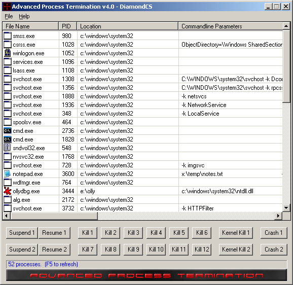 Advanced Process Termination Version 4.0, release date: June 12, 2006 Advanced Process Termination is a simple but powerful utility that provides nine (9) different process termination techniques - all at the click of a button. Process Guard also has powerful anti-hook capabilities to prevent other programs from hooking critical functions (something often done by trojans to prevent their processes from being seen or terminated). In addition to process termination, APT also allows you to Suspend and Resume processes, and also serves as a useful process list utility. (Win 2000/XP/2003) Screenshot | Download (40 kB) |